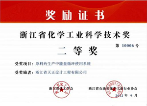 近日,我司开发设计的“原料药生产中能量循环使用系统”荣获由浙江省化工学会、浙江省石油和化学工业行业协会颁发的浙江省化学工业科学技术奖二等奖。