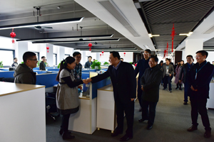 海宇熙春金鸡去,乾坤生意骏犬来。2018年2月26日(农历正月十一),我们迎来了搬迁新大楼后第一个农历新年工作日。公司董事长、党委书记万军带领公司领导班子成员到各楼层办公区看望慰问全体员工,并致以新年的祝福。