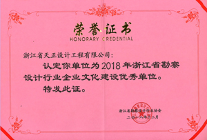 近日,根据浙江省勘察设计行业协会下达的《关于认定2018年浙江省勘察设计行业企业文化建设优秀单位的通知》浙设协字[2018]40号,我司荣获2018年浙江省勘察设计行业企业文化建设优秀单位。
